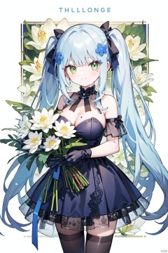 artist:tianliang duohe fangdongye,1girl, bangs, bare_shoulders, blue_dress, bouquet, breasts, character_name, cleavage, closed_mouth, daisy, dress, eyebrows_visible_through_hair, floral_background, flower, gloves, green_eyes, hair_ornament, hk416_\(girls'_frontline\), holding_bouquet, holding_flower, lily_\(flower\), lily_of_the_valley, lily_pad, long_hair, looking_at_viewer, lotus, low_twintails, mole, multi-tied_hair, ribbon, smile, solo, strapless_dress, thighhighs, vase, very_long_hair, white_flower, white_rose