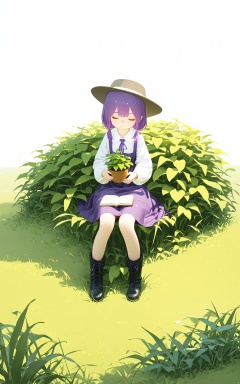 1girl, boots, closed_eyes, closed_mouth, grass, hat, holding, long_sleeves, plant, purple_hair, sitting, skirt, solo
