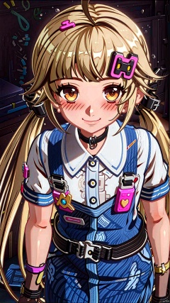 1girl, solo, long hair, looking at viewer, smile, bangs, blonde hair, simple background, shirt, hair ornament, gloves, bow, twintails, brown eyes, closed mouth, white shirt, ahoge, short sleeves, hair bow, cowboy shot, choker, black gloves, belt, virtual youtuber, fingerless gloves, orange eyes, hand on hip, low twintails, black choker, bandaid, overalls