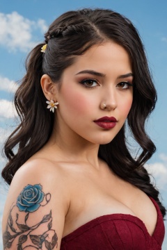 (best quality, 4k, 8k, highres, masterpiece:1.2), ultra-detailed, (realistic, photorealistic, photo-realistic:1.37), 1girl,solo,long hair,breasts,black hair,hair ornament,dress,cleavage,brown eyes,medium breasts,upper body,braid,flower,outdoors,sky,day,cloud,hair flower,,blue sky,lips,tattoo,makeup,rose,facial mark,piercing,lipstick,hair over shoulder,realistic,piercing,lip piercing