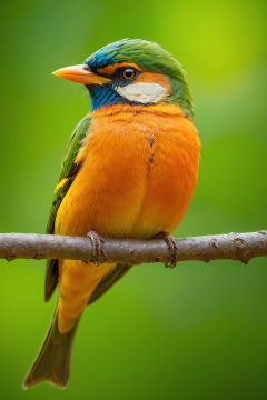 a colorful bird sitting on a tree branch, capturing the intricate details with macro photography, vibrant colors and the smallest of details, showcasing the beauty of nature, (best quality, 4K, highres, realistic:1.37) to ensure a masterpiece, capturing the bird's feather patterns in ultra-detailed precision, emphasizing the distinct hues and shades, highlighting the bird's unique characteristics, the luscious green of the tree branch contrasting with the rich, vibrant colors of the bird, creating a visually stunning image, with studio lighting to enhance the bird's features, capturing its beady eyes and delicate beak, the soft glow of natural sunlight illuminating the scene, creating a warm and welcoming atmosphere.