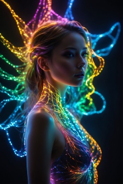 silhouette of a woman, phantasmagorical figure, translucent skin, translucent body, portrait, neon lights, light particles, colorful, cmyk colors, backlit, best quality, 4k, 8k, highres, masterpiece:1.2, ultra-detailed, realistic, photo-realistic:1.37, HDR, UHD, studio lighting, ultra-fine painting, sharp focus, physically-based rendering, extreme detail description, professional, vivid colors, bokeh, portraits, landscape, horror, anime, sci-fi, photography, concept artists, vibrant color palette, soft and warm lighting