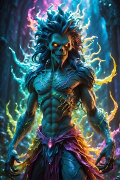 (best quality, 8K, highres, masterpiece), ultra-detailed, (photorealistic, cinematic), illustration painting of a luminous and enchanting bad guy undead/human-like creature with vibrant and dynamic anime-style colors. The creature, with dark, colorful hair, strikes a dynamic pose in a brilliantly lit fantasy realm environment filled with a kaleidoscope of colors. The mid-shot composition and rule of thirds depth of field emphasize intricate details, creating a fantastical realm that bursts with subtle and vibrant colors. The use of light particles enhances the scene's grandeur and awe, making it a stunning visual masterpiece in a double-exposure style. The strong outlines contribute to the scene's cinematic feel, creating a super colorful and visually captivating narrative
