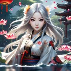(masterpiece,best quality,extremely detailed CG unity 8k wallpaper,ultra-detailed),(best illumination,best shadow,an extremely delicate and beautiful),ink_wash_painting,night,(tai_chi:1.25),(yin_yang:0.85),ba gua,swirl,(the_bottom_of_the_bottlebackground:1.1),(1_girl:1.2),solo,The character is in the center of the frame,medium_full_shot,hanfu,taoist_robes,celestial_being_uniform,long_hair,(alternate hair color:1.3),white hair,black hair,a small red ornament,beautiful_detailed_eyes,indigo_eyes,(girl_surrounded_by_floating_water_flow:1.3),medium_breasts,wind,lotus,(cloudy:1.1),(stratocumulus_stratiformis:1.35),looking_at_viewers,cowboy shot