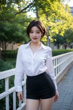 Outdoor scenery, pretty face, short hair , Edge lighting, (high detail skin: 1.2) , 8K Ultra HD, high quality, high resolution, the best ratio of four fingers and a thumb, white shirt, big chest,  advanced feeling, 1 girl, black 8d smooth stockings,