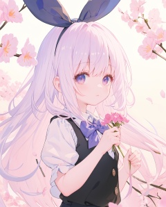 masterpiece, best quality, highres,(child),1girl, solo, short hair, bow, bowtie, shirt, short sleeves, cherry blossoms, vest, upper body, white shirt, hairband, green vest, looking at viewer, green eyes, white hair, bangs, closed mouth, ribbon, holding petal, flower, hair ribbon, collared shirt, hitodama, black ribbon, hand up, petals, puffy short sleeves, puffy sleeves, breasts, pink flower,(child), [from side] <lora:云雀art_v1:0.8> <lora:color:0.6>