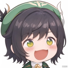smile, solo, hat, black hair, white background, green headwear, simple background, chibi, open mouth, venti \(genshin impact\), male focus, blush, 1boy, portrait, cosplay, beret, bangs, bow, :d