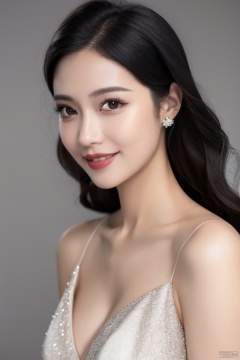 1girl, solo, breasts, cleavage, black hair, long hair, realistic, looking at viewer, smile,simple background, grey background, parted lips, bare shoulders, lips, black eyes, upper body, off shoulder,wedding_dress