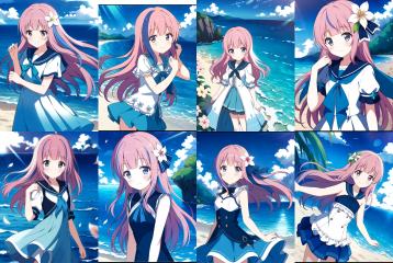 masterpiece,best quality,extremely detailed CG unity 8k wallpaper,Depth of field,cinematic lighting,backlighting,cel shading,anime screencap,long hair,beautiful detailed eyes,1girl,finely detail,(upper body:1.2),pink hair,(blue streaked hair:1.25),blue sky with cloud,sea,(flower near sea:1.5),art by princess connect!,original,seductive smile,random pose,solo,looking at viewer,ribbon,standing on beach,near water,blush,blunt bangs,blue water,<lora:pcr-xl-fp8:0.7>,