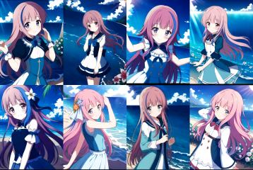 masterpiece,best quality,extremely detailed CG unity 8k wallpaper,Depth of field,cinematic lighting,backlighting,cel shading,anime screencap,long hair,beautiful detailed eyes,1girl,finely detail,(upper body:1.2),pink hair,(blue streaked hair:1.25),blue sky with cloud,sea,(flower near sea:1.5),art by princess connect!,original,seductive smile,random pose,solo,looking at viewer,ribbon,standing on beach,near water,blush,blunt bangs,blue water,<lora:pcr-xl-fp8:0.8>,