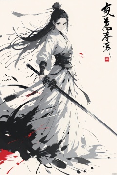 a girl,long hair,black hair,full body,smwuxia,Chinese text,blood splatter,weapon:sw,blood