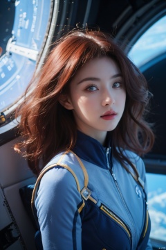 masterpiece,best quality,Cell shaded illustration. Petite female astronaut with very long glowing light red hair,hair floating in zero gravity,floating in the window of her space station looking at a vibrant,blue and violet nebula,Shoulders back. perfect face.. electric blue glowing swirl tattoos. Glowing gold eyes. below perspective bottom perspective,(realistic art style),