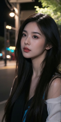 (RAW photo, 4k, realistic, exquisitely detailed skin),masterpiece,best quality,unity 8k wallpaper,ultra detailed,cinematic look,natural skin texture,extremely realistic skin texture,finely detailed face,(film grain:1.2),cinematic angle,Fujifilm XT3,(highlydetailed),(night scene),(street corner),(1girl),(detailed lighting),(contrast),(mysterious atmosphere),vivid illumination,masterful technique,harmonious composition,immersive atmosphere,stunning visuals,