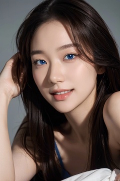 Best quality, masterpiece, ultra high res, (photorealistic:1.4), raw photo,seductive smile, cute, realistic lighting,blue eyes,long hair,wukelan,brown hair,linyuner