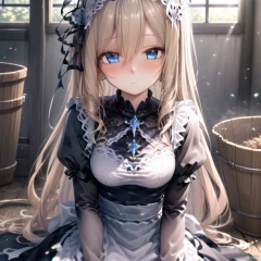 1girl, long hair, looking at viewer, blush, bangs, blue eyes, blonde hair, brown hair, long sleeves, dress, hair between eyes, sitting, closed mouth, frills, solo focus, indoors, apron, black dress, arm up, maid, maid headdress, window, sunlight, white apron, light particles, maid apron, broom, bucket,(extremely detailed CG unity 8k wallpaper),(((extremely detailed face and eyes,extremely beautiful and delicate face and eyes,wallpaper, extremely detailed face and eyes,fluttered detailed surroundings,extremely detailed CG unity 8k wallpaper,amazing,highly detailed,)), (best illustration),(best shadow), ((an extremely delicate and beautiful)),