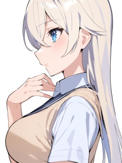sailulu style,1girl, solo, long hair, blue eyes, white background, shirt, simple background, sweater vest, short sleeves, upper body, white shirt, blush, from side, hair between eyes, profile, hand on own chest, eyebrows visible through hair, school uniform, breasts, collared shirt, bangs, closed mouth, vest, silver hair, blonde hair, medium breasts, parted lips, masterpiece, best quality,
