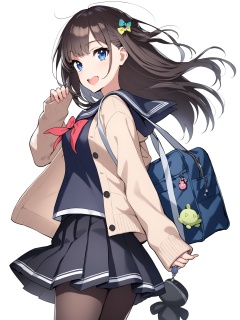 sailulu  style,1girl, solo, pantyhose, long hair, blue eyes, school uniform, bag, skirt, open mouth, black legwear, serafuku, smile, school bag, looking at viewer, bow, pleated skirt, brown hair, hair bow, stuffed toy, stuffed animal, white background, looking back, long sleeves, :d, hair ornament, sleeves past wrists, bangs, charm \(object\), simple background, bag charm, black skirt, cowboy shot, cardigan, floating hair, open clothes, shoulder bag, from side, masterpiece, best quality,