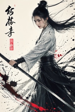 a girl, smwuxia,chinese text,blood, weapon:sw,blood splatter,motion blur,text
