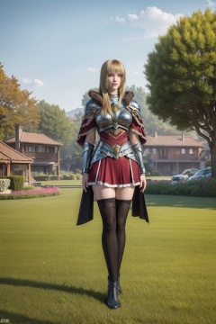 masterpiece,best quality,Florist,shop,Morning sunshine,glass flower house,flower,town,several houses,yard,flowers of various colours,potted plants,trees,chandeliers,signs,distant hills,grass,flowers,fences,yards,distant view,<lora:TianShiYan:0.8>,(Black stockings:1.1),1 girl,cloak,solo,armor,boots,red fur trim,long hair,standing,red skirt,(Blonde hair:0.9),bangs,(Distance 6 meters from her:2.1),