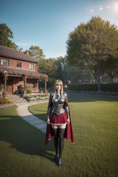 masterpiece,best quality,Florist,shop,Morning sunshine,glass flower house,flower,town,several houses,yard,flowers of various colours,potted plants,trees,chandeliers,signs,distant hills,grass,flowers,fences,yards,distant view,<lora:TianShiYan:0.8>,(Black stockings:1.1),1 girl,cloak,solo,armor,boots,red fur trim,long hair,standing,red skirt,(Blonde hair:0.9),bangs,(Distance 8 meters from her:2.1),