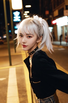 hubg_jsnh,white hair,red eyes,cityscape,cute 1girl,lip biting,seductive leaning forward,detailed face,realistic,photorealistic,(studio light:1.2),evil smile,choker,Deep photo,depth of field,shadows,messy hair,seductive silhouette play,dark,nighttime,dark photo,grainy,dimly lit,shot on RED camera,harsh camera flash ((eyes closed)),bangs,hime cut,fashion model,full body,