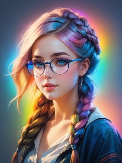 masterpiece,best quality,Light Projection,a portrait of a beautiful girl turner painted on wall with light,stunning beauty,soft light, pastel colors, muticolore hair, punk, line art,simple background, modernism, glowing lips, piercings, lips closed, light smile, masterpiece, natural style, braids, neon, detailled iris, rich woman, big glasses, nerd