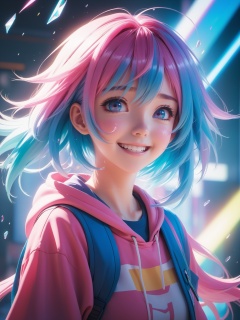 Best quality,masterpiece,1gril,hand,tears,pink and blue hair,smile,medium hair,room,film grain,glitch,lens_flare,colorful,chromatic aberration,super wide angle,dynamic pov,closed mouth,Intense emotional expression: death,amazing quality,absurdres,anime,very aesthetic,