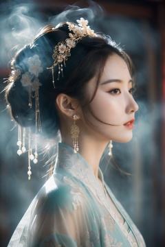 best quality,masterpiece,realistic,(film grain:1.3),details skin,real skin,Double Exposure Style,Volumetric Lighting,hair ornament,a girl with Wrap top,Traditional Attire,Artistic Calligraphy and Ink,light depth,dramatic atmospheric lighting,Volumetric Lighting,double image ghost effect,image combination,double exposure style,china dress,smog,backlighting,Tyndall effect,