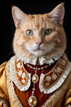 Cat,orange tabby,renaissance costume,ruff collar,golden robe,studio portrait,noble demeanor,detailed embroidery,ornate jewelry,dark background,regal pose,sharp focus,historical fashion,rich textures,cat head person,