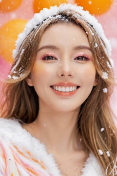 masterpiece,best quality,1girl,smile,golden and orange swirling vortexes colourful cloudy and smoke and colorful background,(snowing) (( swirling vortexes colourful hair)),wear white fur coat,((long Hair)),((right side)),emotional face,close up,studio light,studio,(((makeup portrait, pink eye shadow))),((with many golden and orange swirling vortexes colourful snow and feather on face)),(film grain:1.3),details skin,real skin,