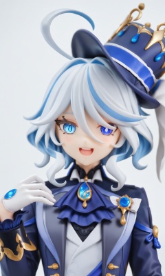 figure,masterpiece,best quality,<lora:furina:1>,1girl, furina \(genshin impact\), genshin impact, cowlick, top hat, blue jacket, blue ascot, blue brooch, kodona, simple background, open mouth, blue headwear, streaked hair, upper teeth only, solo, long hair, light blue hair, white background, smile, white hair, ahoge, mismatched gloves, white gloves, long sleeves, hair between eyes, blue gemstone,