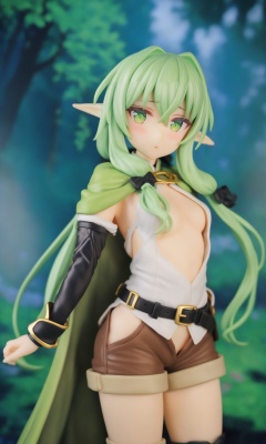 figure,masterpiece,best quality,<lora:high_elf:1>,highres,cape,black_belt,bow,solo,looking_at_viewer,1girl,outdoors,brown_shorts,high_elf_archer_\(goblin_slayer!\),belt_buckle,sidelocks,cowboy_shot,blush,english_commentary,small_breasts,open_shorts,no_panties,tree,forest,short_shorts,