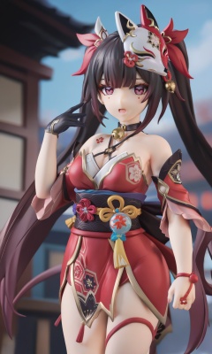 figure,masterpiece,best quality,illustration,highres,ultra-detailed,1girl,sparkle \(honkai: star rail\),twintails,hair ornament,solo,off shoulder kimono,mask on head,detached sleeves,choker,obi,single glove,wristband,criss-cross halter,thigh strap,cowboy shot,standing,japanese street,outdoors,depth of field,smug,open mouth,hands on hip,looking at viewer ,<lora:Char-HonkaiSR-Sparkle-XL-V1:0.9>,