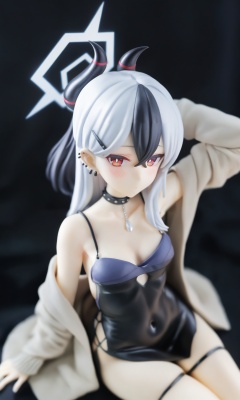 figure,masterpiece,best quality,<lora:kayoko:1>,1girl,solo,horns,multicolored_hair,kayoko_\(blue_archive\),red_eyes,dress,white_background,simple_background,black_hair,halo,piercing,ear_piercing,choker,looking_at_viewer,black_dress,white_hair,arm_up,wings,armpits,sitting,small_breasts,bangs,hair_between_eyes,collarbone,single_wing,hairclip,two-tone_hair,closed_mouth,blush,breasts,hair_ornament,covered_navel,hand_in_own_hair,off_shoulder,long_hair,arm_behind_head,open_clothes,streaked_hair,sleeveless,sleeveless_dress,black_choker,
