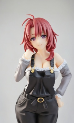 figure,masterpiece,best quality,<lora:cow_girl:1>,highres,1girl,smile,cowboy_shot,long_sleeves,grey_shirt,black_overalls,black_belt,pants,closed_mouth,collarbone,frilled_shirt,looking_at_viewer,cleavage,cow_girl_\(goblin_slayer!\),solo,