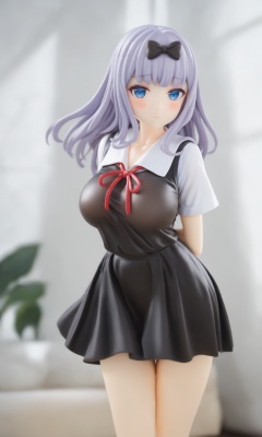 figure,masterpiece,best quality,<lora:fujiwara_chika:1>,1girl,fujiwara chika,shuuchiin academy school uniform,solo,blush,black bow,black dress,looking at viewer,red ribbon,short sleeves,indoors,arms behind back,neck ribbon,pinafore dress,closed mouth,summer uniform,cowboy shot,collarbone,
