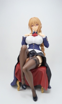figure,masterpiece,best quality,<lora:guild_girl:0.8>,single_braid, commentary_request, pantyshot, large_breasts, black_thighhighs, crossed_legs, sitting, solo, shrugging, 1girl, uniform, highres, white_panties, ascot, looking_at_viewer, guild_girl_\(goblin_slayer!\), black_skirt, garter_straps, head_tilt