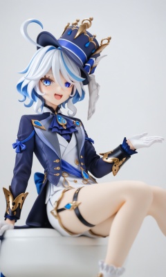 figure,masterpiece,best quality,<lora:furina:1>,1girl,furina \(genshin impact\),genshin impact,cowlick,top hat,blue jacket,blue ascot,blue brooch,kodona,simple background,open mouth,blue headwear,streaked hair,upper teeth only,solo,long hair,light blue hair,white background,smile,white hair,ahoge,mismatched gloves,white gloves,long sleeves,hair between eyes,blue gemstone,
