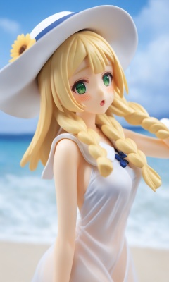 figure,masterpiece,best quality,<lora:lillie_(pokemon):1>,collared_dress, highres, solo, cloud, 1girl, sun_hat, outdoors, sundress, twin_braids, white_headwear, blush, arm_up, open_mouth, eyelashes, see-through, white_dress, looking_at_viewer, sweat, :o, lillie_\(pokemon\), day, commentary_request, sleeveless_dress, comic, sky