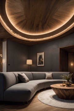 (Best quality, 4K, architectural photography, Masterpiece: 1.2), (Realiy: 1.4), (Installation art:1.2), bold lighting, Complex log curved modeling background, depth of fields,Gray sofa,Detailed details,High-definition realism, Light master<lora:EMS-317795-EMS:0.800000>