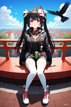 score_9, score_8_up, score_7_up, score_6_up, score_5_up, score_4_up, best quality,masterpiece,4k,very aesthetic,uncensored,rating_explicit,rating_questionable, BREAK \\\\\\\\\\\nai3, 1girl, long hair, thighhighs, solo, black hair, white thighhighs, shorts, holding, sitting, green eyes, bird, white footwear, shoes, black shorts, scarf, sneakers, jacket, looking at viewer, outdoors, bangs, long sleeves, shirt, open clothes, full body, short shorts, can, black jacket, sky, holding can, railing, ribbon, black shirt, day, open jacket, parted lips, white ribbon, building, black scarf, crow, cityscape, rooftop,////////////////////////// huahuo, mask on head, black hair, twintails, purple eyes, fox mask,Cherry blossom tattoo, chest tattoo<lora:EMS-311794-EMS:0.700000>, <lora:EMS-271962-EMS:0.500000>, <lora:EMS-36433-EMS:0.400000>