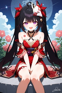 score_9,score_8_up,score_7_up,best quality,masterpiece,source_anime,\\\\\\\\\\\\nai3, 1girl, solo, ahoge, virtual youtuber, , flower, looking at viewer, smile,bangs,between legs, :d, fang, \\\\\\\\\\\\\\The girl on the top of the building, the starry sky, the meteor crossed, the city skyline behind her was extremely beautiful, the breeze was blowing, the girl's heart was confused, her face was red, and she stroked her hair\\\\\\\\\\\\\Top view, panorama, fisheye lens,////////////////////////// huahuo, mask on head, black hair, twintails, purple eyes, fox mask,Cherry blossom tattoo, chest tattoo<lora:EMS-36433-EMS:0.300000>, <lora:EMS-311794-EMS:0.700000>, <lora:EMS-271962-EMS:0.500000>