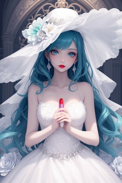 1 girl, solo,thin and tall, aqua eyes, multicolored eyes, ((Eye highlight)), ((Red glossy lip gloss)), Earrings, bangs, long hair,wedding dress,Wedding Hat,flowertheme,(((masterpiece,best quality))),((good structure)),((Good composition)), ((clear, original,beautiful)), (clear details, clear light,clear structure),