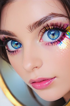 Rainbow foil,1girl, solo, looking at viewer, blue eyes, brown hair, black hair, blurry, lips, eyelashes, makeup, depth of field, portrait, close-up, reflection, realistic, eye focus