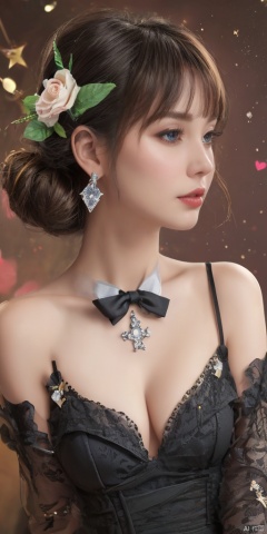1girl, solo,glowing,blush,see-through,black rose,long hair,Hexangular Star, looking at viewer, bangs, blue eyes, black hair, hair ornament, long sleeves, dress, bow, ribbon, holding, hair ribbon, heart, cowboy shot, frills, parted lips, puffy sleeves, wide sleeves, bowtie, black dress, red bow, red ribbon, juliet sleeves, red bowtie,,jewelry, earrings,lips, makeup, portrait, eyeshadow, realistic, nose,{{best quality}}, {{masterpiece}}, {{ultra-detailed}}, {illustration}, {detailed light}, {an extremely delicate and beautiful}, a girl, {beautiful detailed eyes}, stars in the eyes, messy floating hair, colored inner hair, Starry sky adorns hair, depth of field, large breasts,cleavage,blurry, no humans, traditional media, gem, crystal, still life, Dance,movements, All the Colours of the Rainbow,zj,