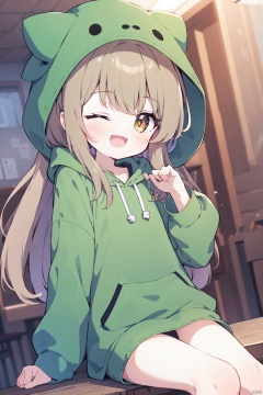 masterpiece, best quality, 1girl, one eye closed, solo, hood, green hair, looking at viewer, long sleeves, open mouth, smile, blush, green jacket, bangs, brown eyes, sparkle, brown hair, sitting, jacket, hood up, long hair, blurry, fangs, animal hood, green hoodie, claw pose, hand up, ;d, fang
