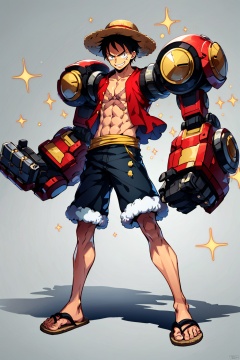 1boy,abs,full body,fur trim,gradient,gradient background,grey background,hat,helmet,male focus,mecha,mechanical arms,monkey d. luffy,open clothes,pectorals,power armor,robot,sandals,shorts,single mechanical arm,smile,solo,sparkle,straw hat