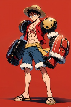 1boy,abs,black hair,full body,fur trim,hat,helmet,holding helmet,male focus,monkey d. luffy,pectorals,red background,red theme,sandals,scar,simple background,straw hat