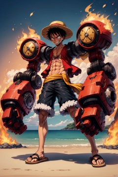1boy,black hair,fire,fur trim,hat,machinery,male focus,mecha,monkey d. luffy,open clothes,robot,sandals,shorts,sitting,smile,straw hat