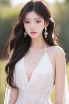1girl,solo,looking at viewer,upper body,earrings,lips,realistic, long hair,White evening dress, chest